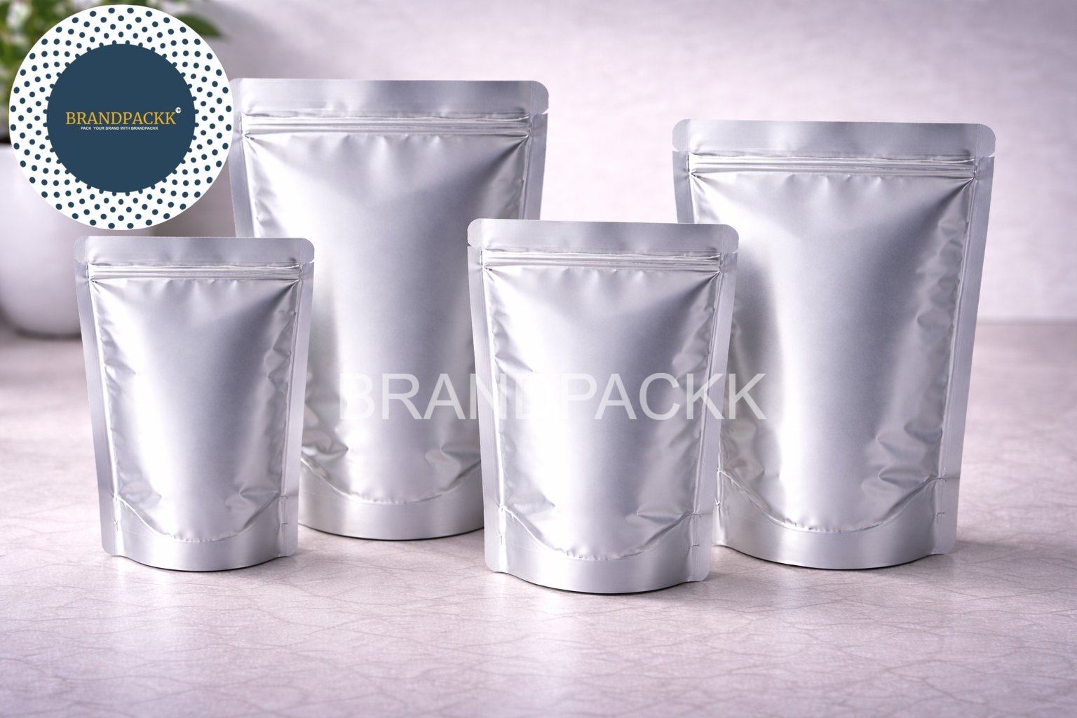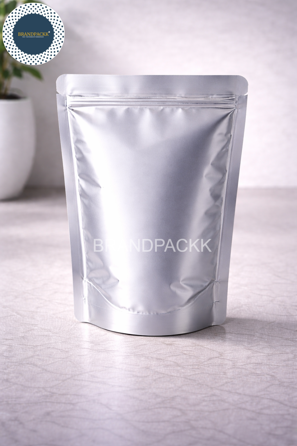 At Brandpackk, our Aluminium Zipper Pouches are designed to keep your products fresh, protected, and visually appealing. With a high-barrier aluminium structure, they effectively shield contents from moisture, oxygen, and light, ensuring longer shelf life and consistent quality. The resealable zipper adds everyday convenience, making them perfect for products that require repeated use. Combining durability with a sleek, premium finish, these pouches help your brand stand out while delivering reliable performance.