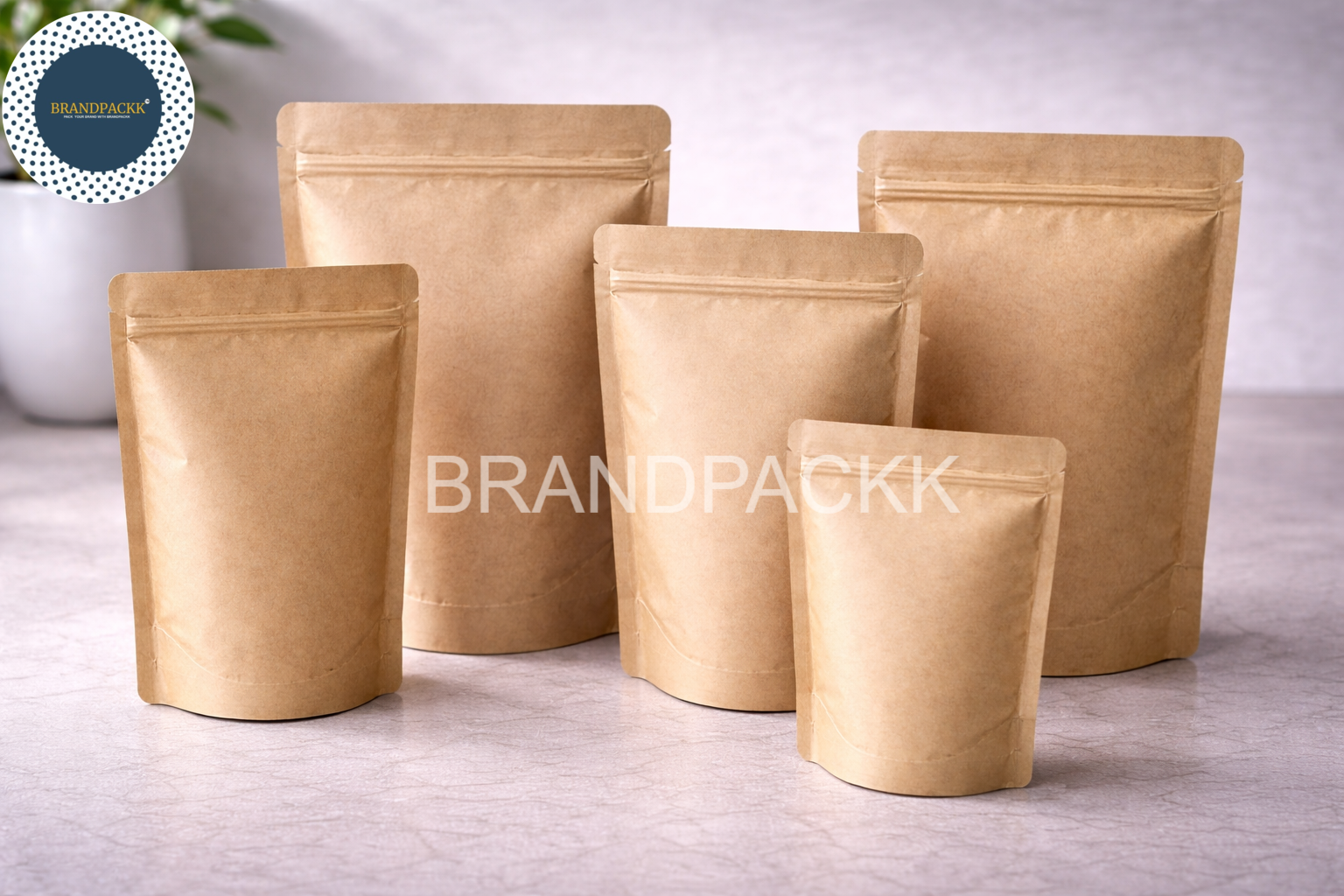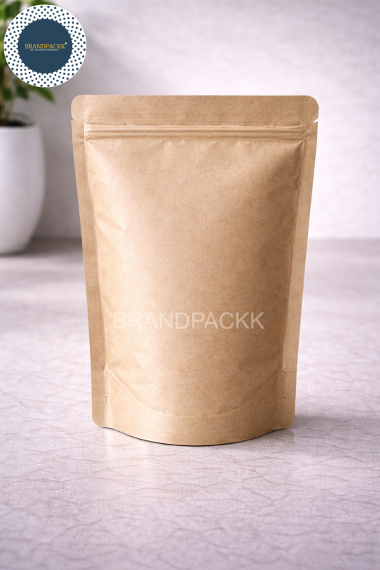 ADDITIONAL BENEFITS : Eco-friendly kraft paper finish for a natural and premium look, fully opaque structure for enhanced product protection from light, strong stand-up design for better shelf display, resealable zipper for convenience and freshness retention, customizable printing options for branding, and ideal for long-term dry storage under ambient conditions